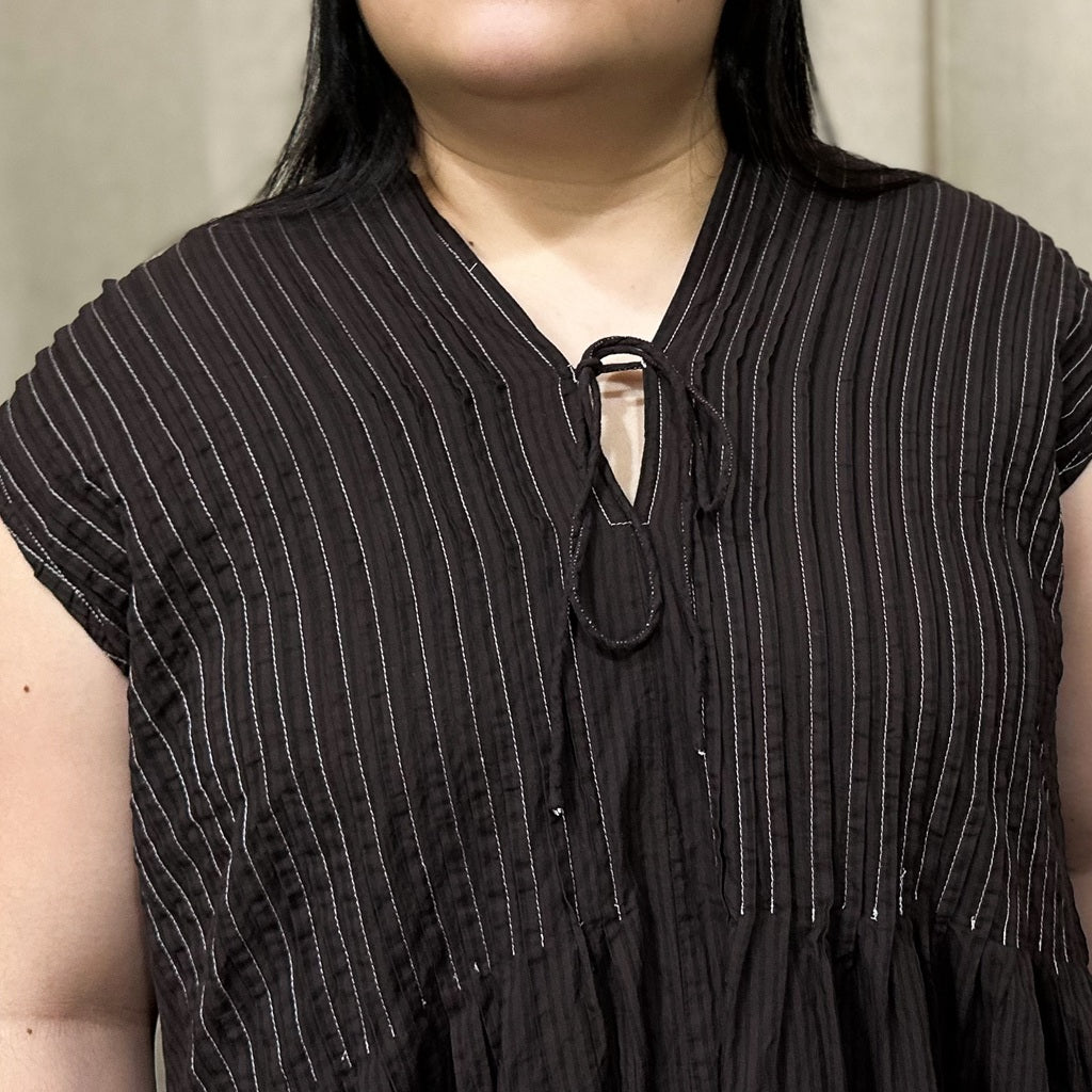 White topstitching enhances the intricate pintucks across the bodice, adding artisanal texture and subtle structure.