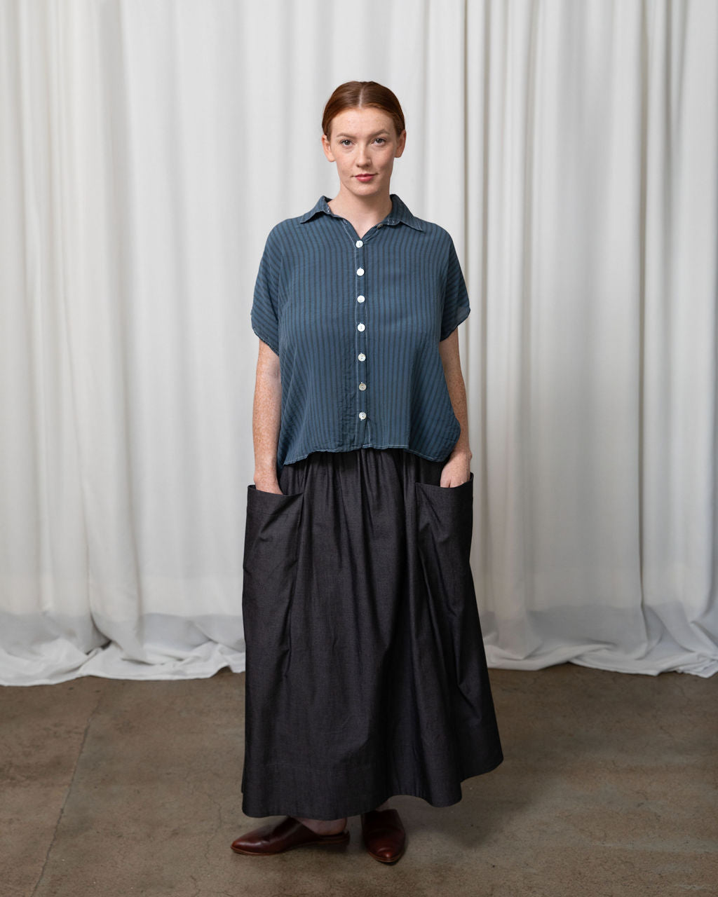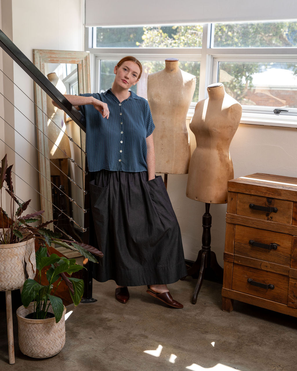 Modern, grounded, and endlessly wearable — the Dessa Skirt in Charcoal Cotton Denim offers a structured feel with everyday softness. Crafted from breathable OEKO-TEX certified cotton denim in a deep charcoal hue, this fabrication gives the skirt a slightly more tailored silhouette while still offering generous flow and comfort.